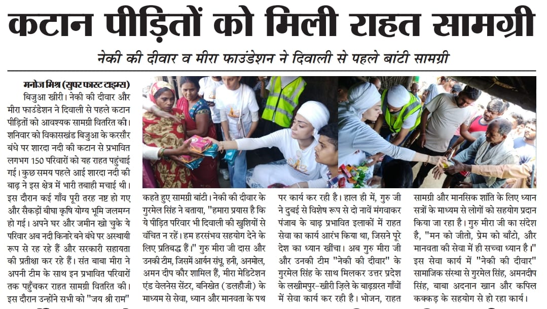 अपने घर और ज़मीन खो चुके ये परिवार अब नदी किनारे बने बंधे पर अस्थायी रूप से रह रहे हैं और सरकारी सहायता की प्रतीक्षा कर रहे हैं। संत बाबा मीरा ने अपनी टीम के साथ इन प्रभावित परिवारों तक पहुँचकर राहत सामग्री वितरित की। इस दौरान उन्होंने सभी को जय श्री राम कहते हुए सामग्री बांटी। नेकी की दीवार के गुरमेल सिंह ने बताया, हमारा प्रयास है कि ये पीड़ित परिवार भी दिवाली की खुशियों से वंचित न रहें। हम हरसंभव सहयोग देने के लिए प्रतिबद्ध हैं। गुरु मीरा जी दास और उनकी टीम, जिसमें आर्यन संधू, हनी, अनमोल, अमन दीप कौर शामिल हैं, मीरा मेडिटेशन एंड वेलनेस सेंटर, बनिखेत ( डलहौज़ी) के माध्यम से सेवा, ध्यान और मानवता के पथ पर कार्य कर रही है।